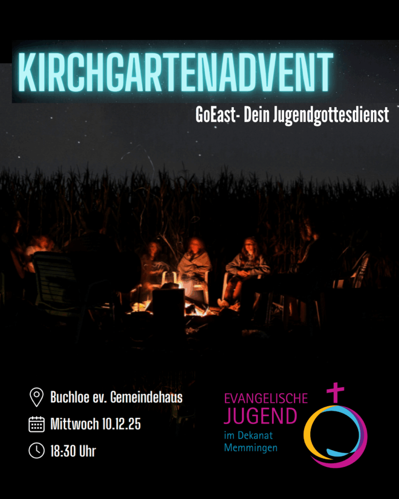 Am 10.12.25 wollen wir unseren „Go East“- Jugendgottesdienst in dier Osthälfte des Dekanats auf eine besondere Art und Weise feiern. Im Ev. Gemeindehaus in Buchloe starten wir um 18:30 Uhr mit dem Gottesdienst und lassen den Abend anschließend bei Punsch und Lebkuchen in adventlicher Atmosphäre ausklingen. Predigen wird unser Dekanatsjugendpfarrer Claudius Wolf.
